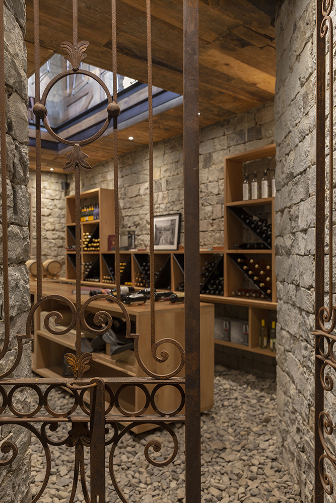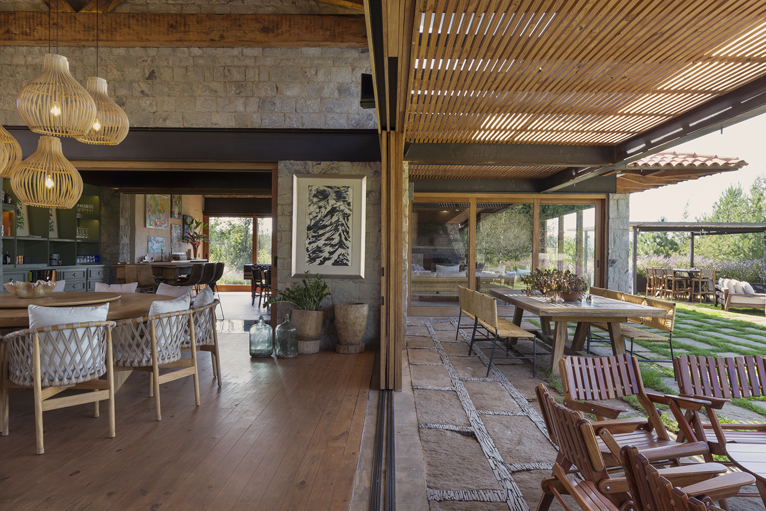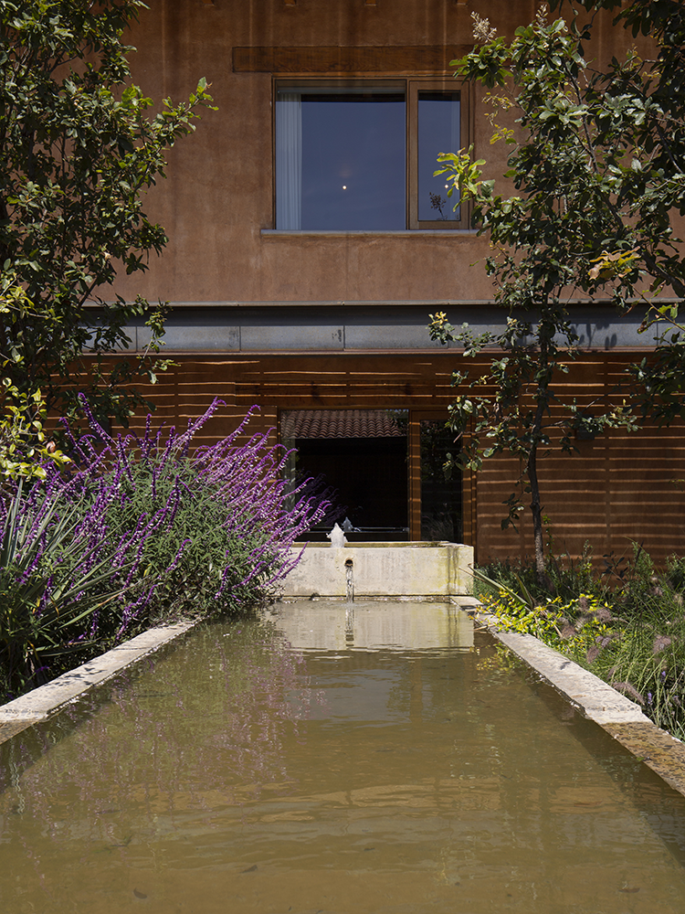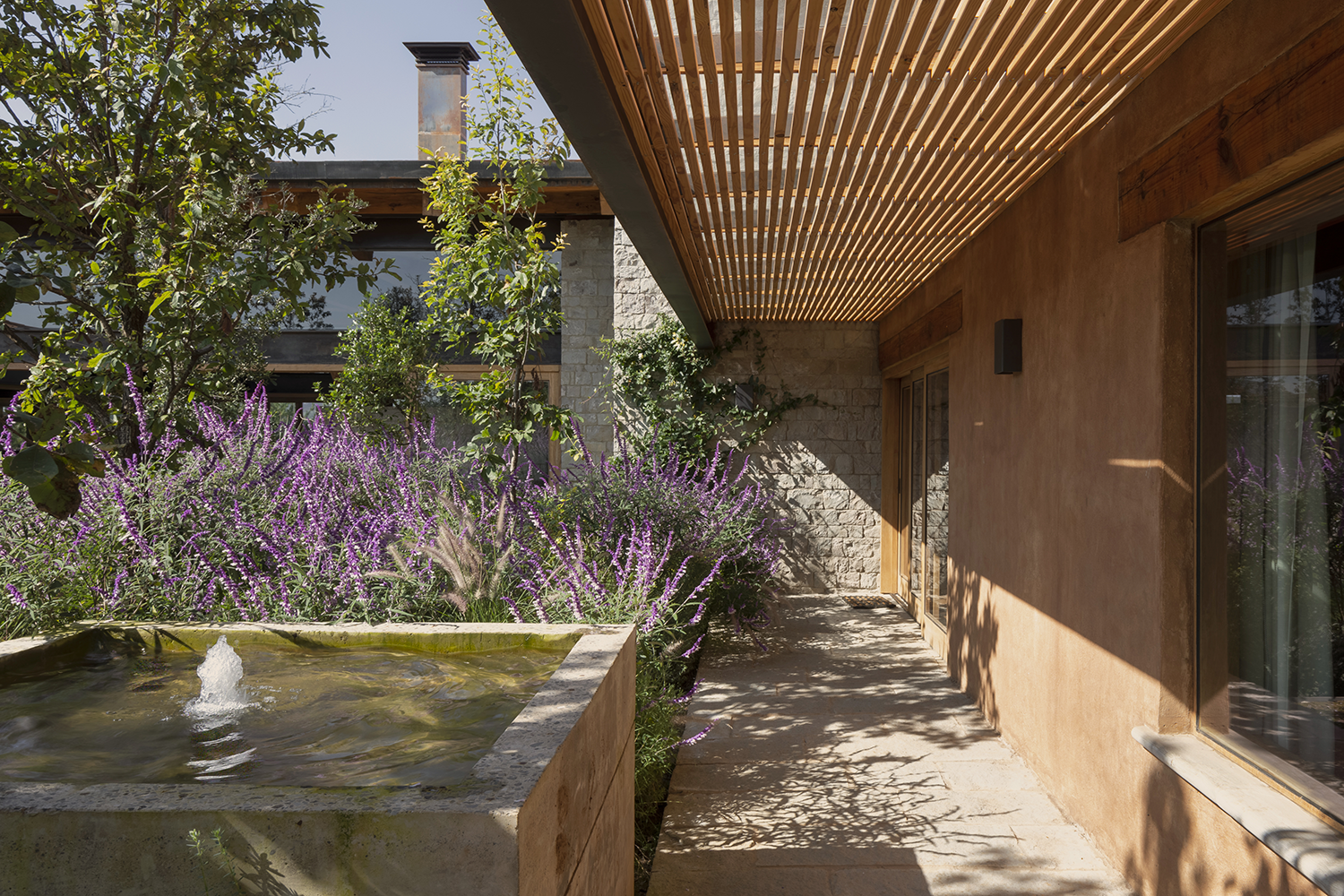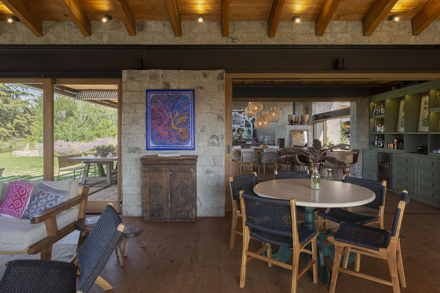Un detalle distintivo es el área de bar, donde se puede observar la cava a través de un cristal en el suelo. La paleta de colores de la casa, en tonos arena, permite que se integre perfectamente con la naturaleza del valle, creando un ambiente de tranquilidad y armonía.