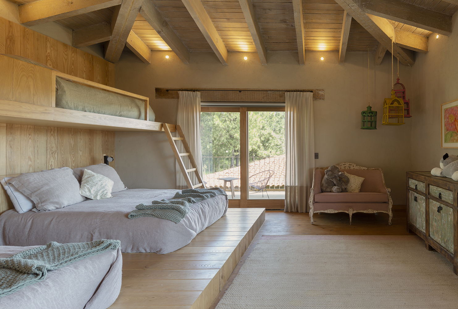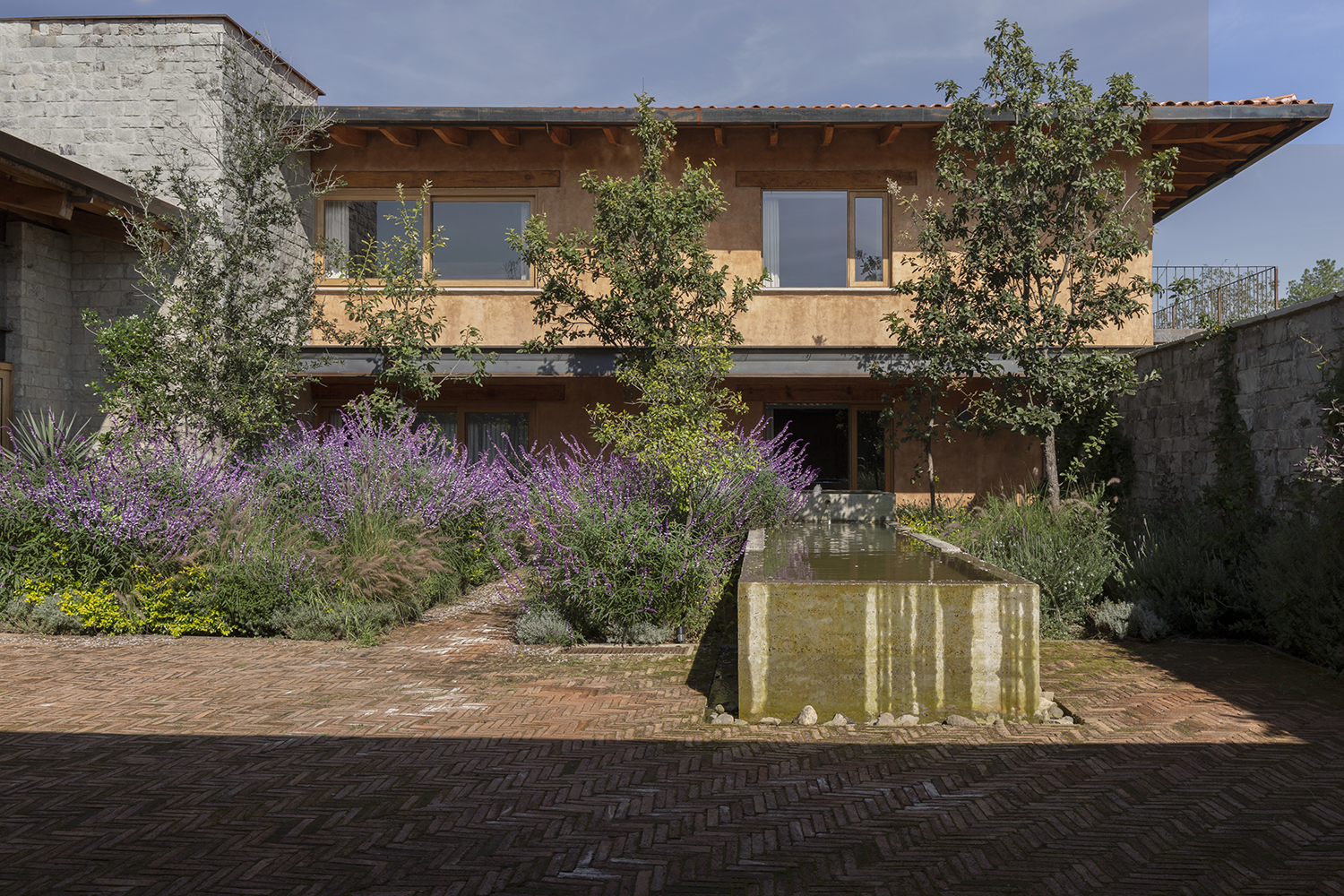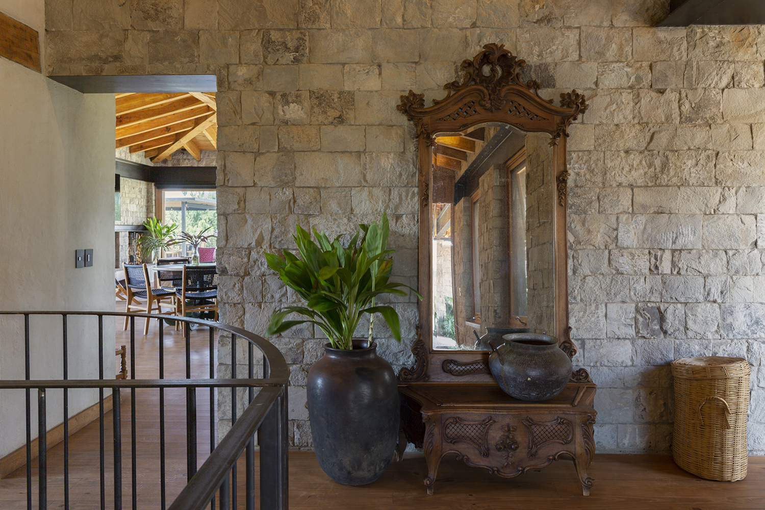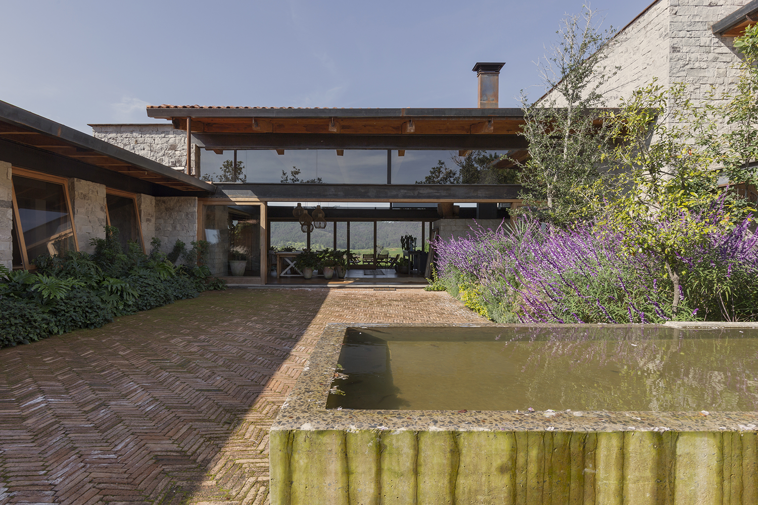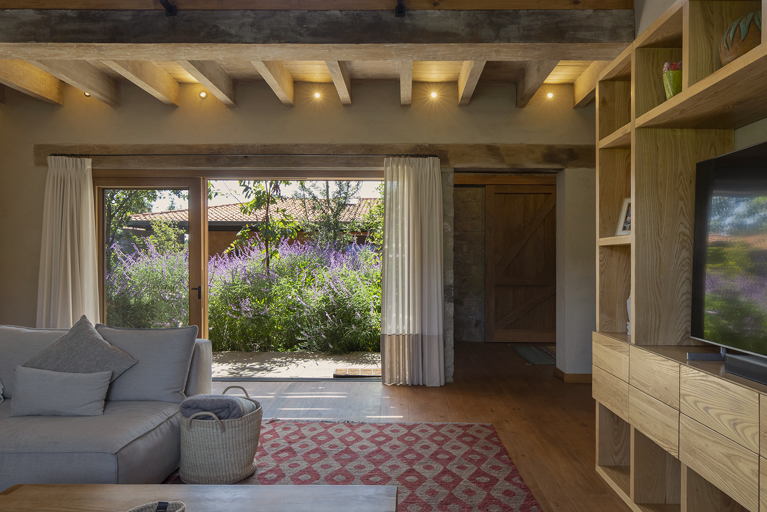 Un detalle distintivo es el área de bar, donde se puede observar la cava a través de un cristal en el suelo. La paleta de colores de la casa, en tonos arena, permite que se integre perfectamente con la naturaleza del valle, creando un ambiente de tranquilidad y armonía.