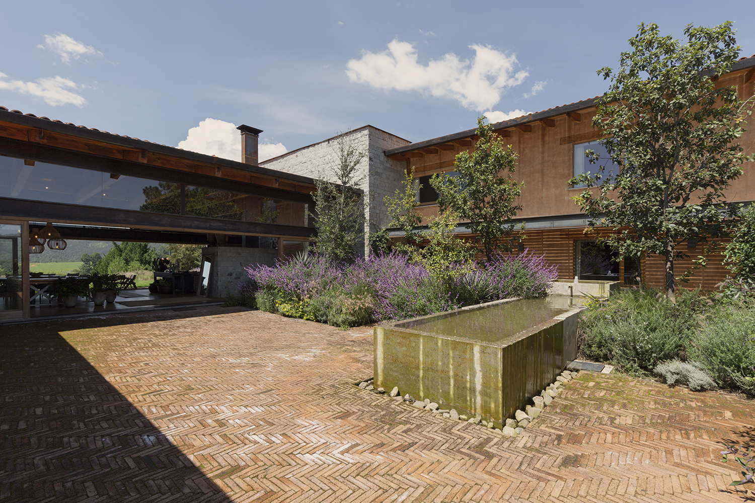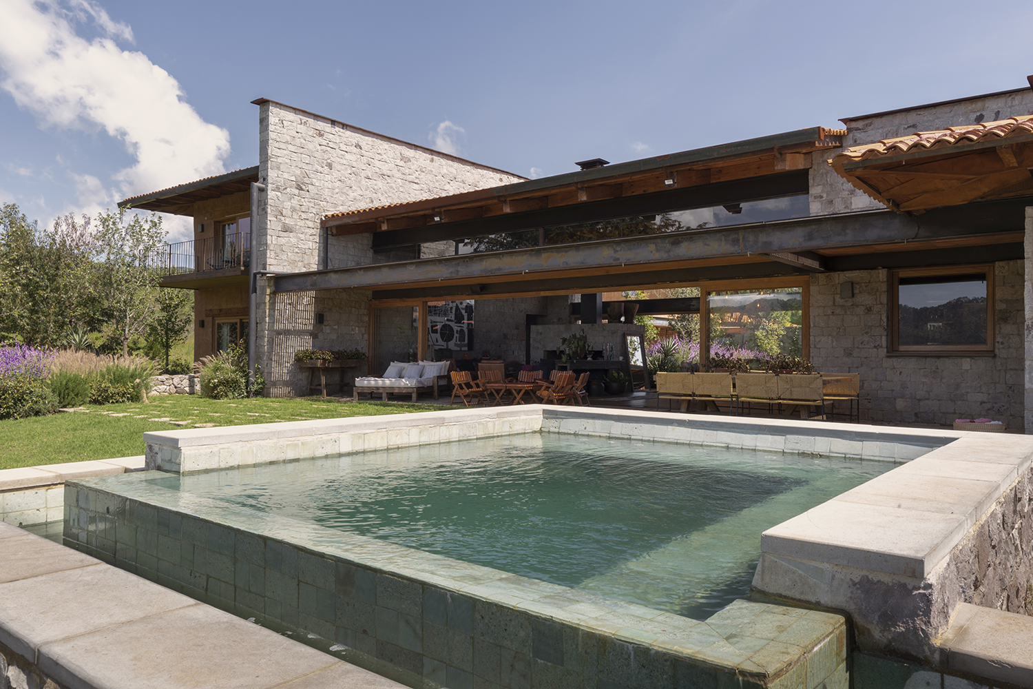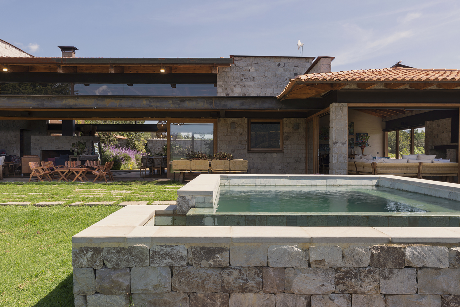 En el centro del jardín, una fuente de agua con una pila de concreto añade un toque sereno al espacio. La casa cuenta con una alberca climatizada que puede utilizarse durante todo el año. Junto a la alberca, hay una terraza con asador y un techo que fomenta la convivencia y el disfrute al aire libre. Las áreas comunes de sala y comedor se abren hacia el patio posterior y el jardín frontal, brindando una vista ininterrumpida hacia las Piedrotas.